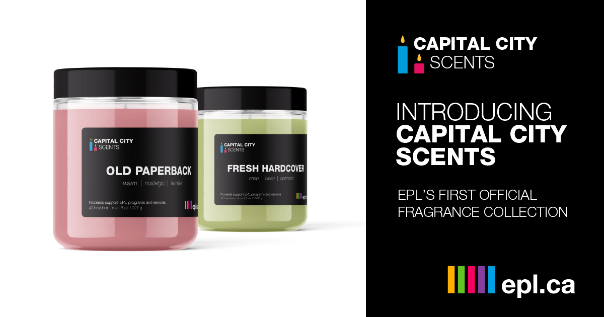 Capital City Scents is EPL's first official fragrance collection — two hand-poured soy candles developed in collaboration with a local Edmonton artisanal candle maker known for sustainable, non-toxic, all-natural scents. The process involved careful testing to capture the character of library materials without producing anything too literal, too perfumed or too gift-shop-adjacent.